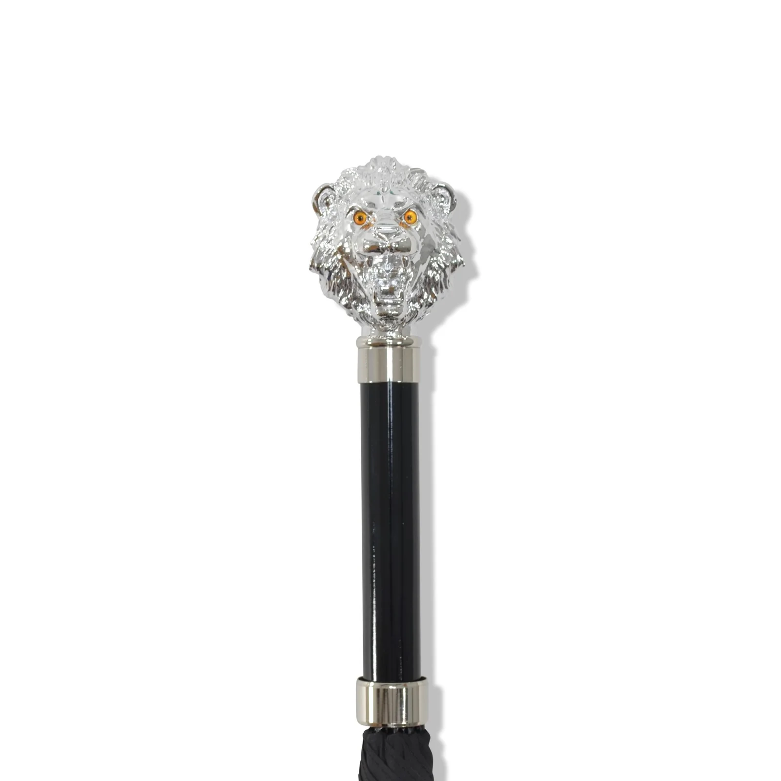 This umbrella comes with a Nickel (Silver) Finish Lion Head on a straight stem handle with Nickel Tip Cup, the umbrella is made on a 25" Classic Fox Steel Tube Frame (brown tube with black ribs) with a Best Polyester cover/canopy. This umbrella also comes with a matching outside case to help keep the umbrella clean when stored.